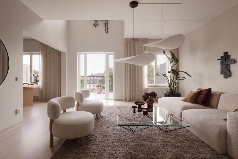 Den ljusa och varma färgskalan löper genom hela bostaden. Här möts modern elegans och genomtänkt funktion med noggrant utvalda material som bidrar till en känsla av kvalitet i varje detalj.