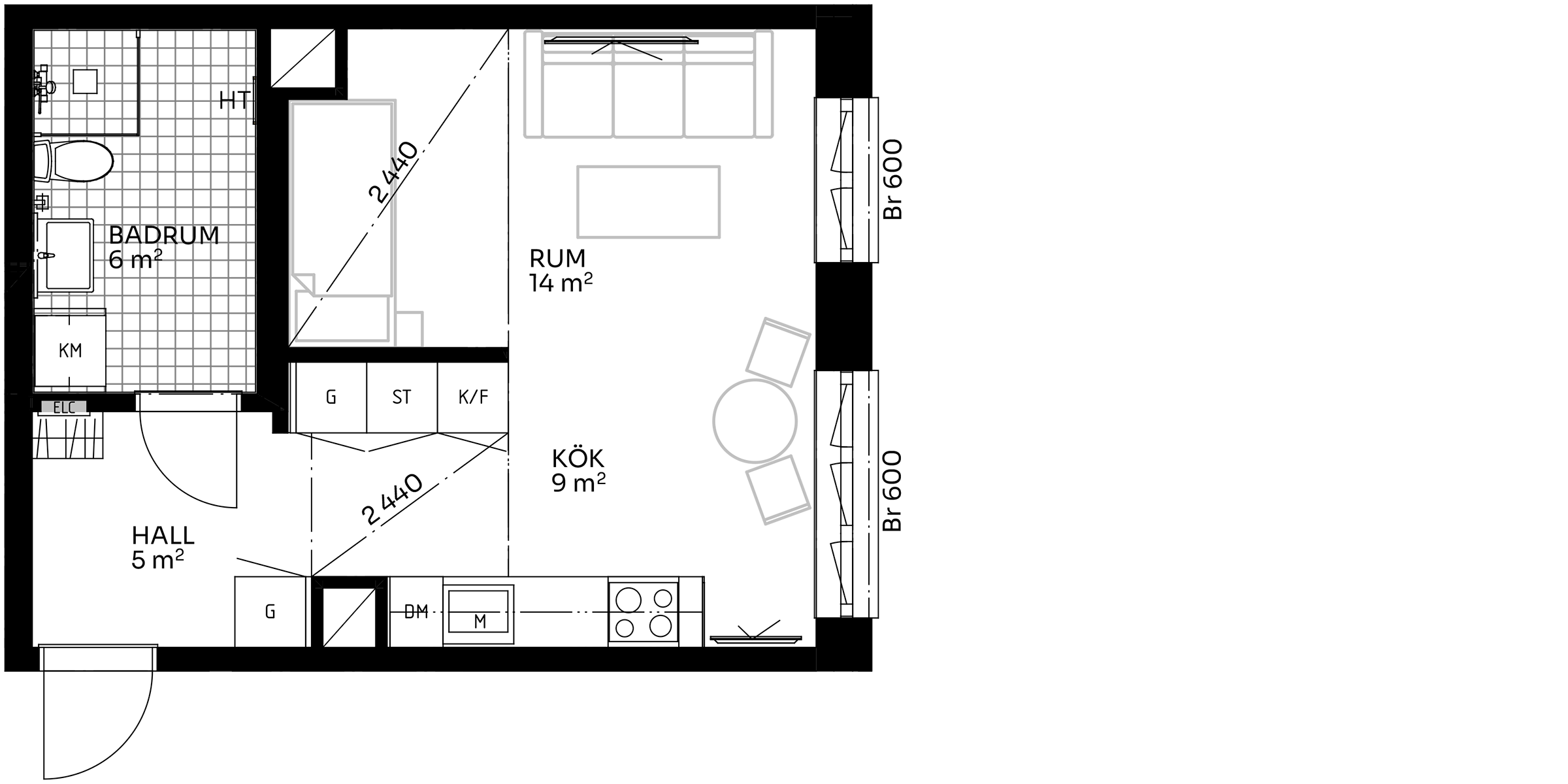 Här erbjuds en modern och kvadratsmart etta där varje kvadratmeter är noga genomtänkt för att skapa både funktion och trivsel. Den generösa takhöjden om 2,7 meter ger en luftig känsla och förstärker rymden i bostaden.