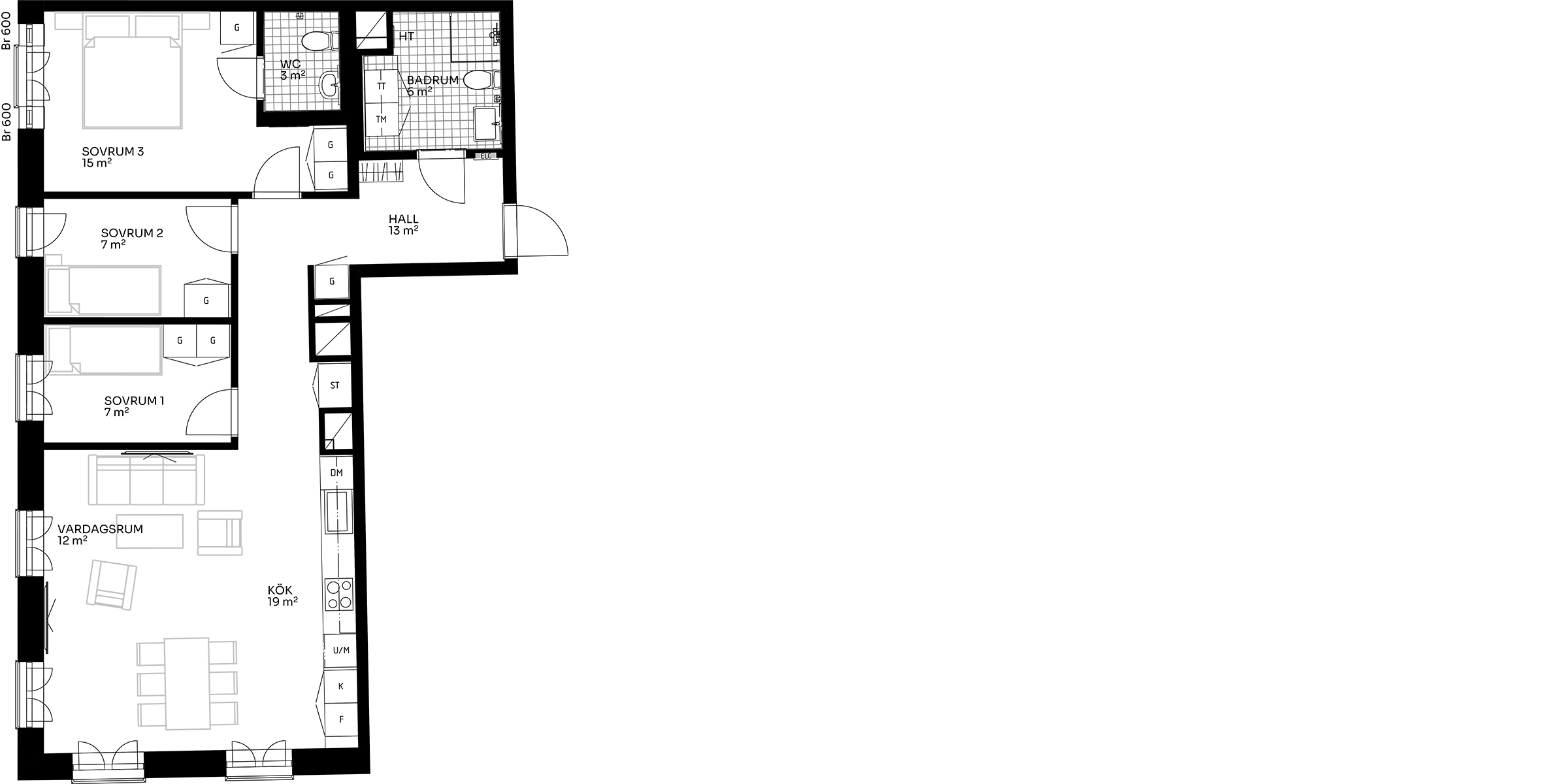 Hjärtat i bostaden är det stora vardagsrummet och köket i öppen planlösning. Här finns gott om plats för både matgrupp och soffhörna, vilket gör detta till en naturlig samlingspunkt för familj och vänner. Köket är fullt utrustat med integrerade vitvaror och en exklusiv bänkskiva i granitkeramik som förenar funktionalitet med stil.