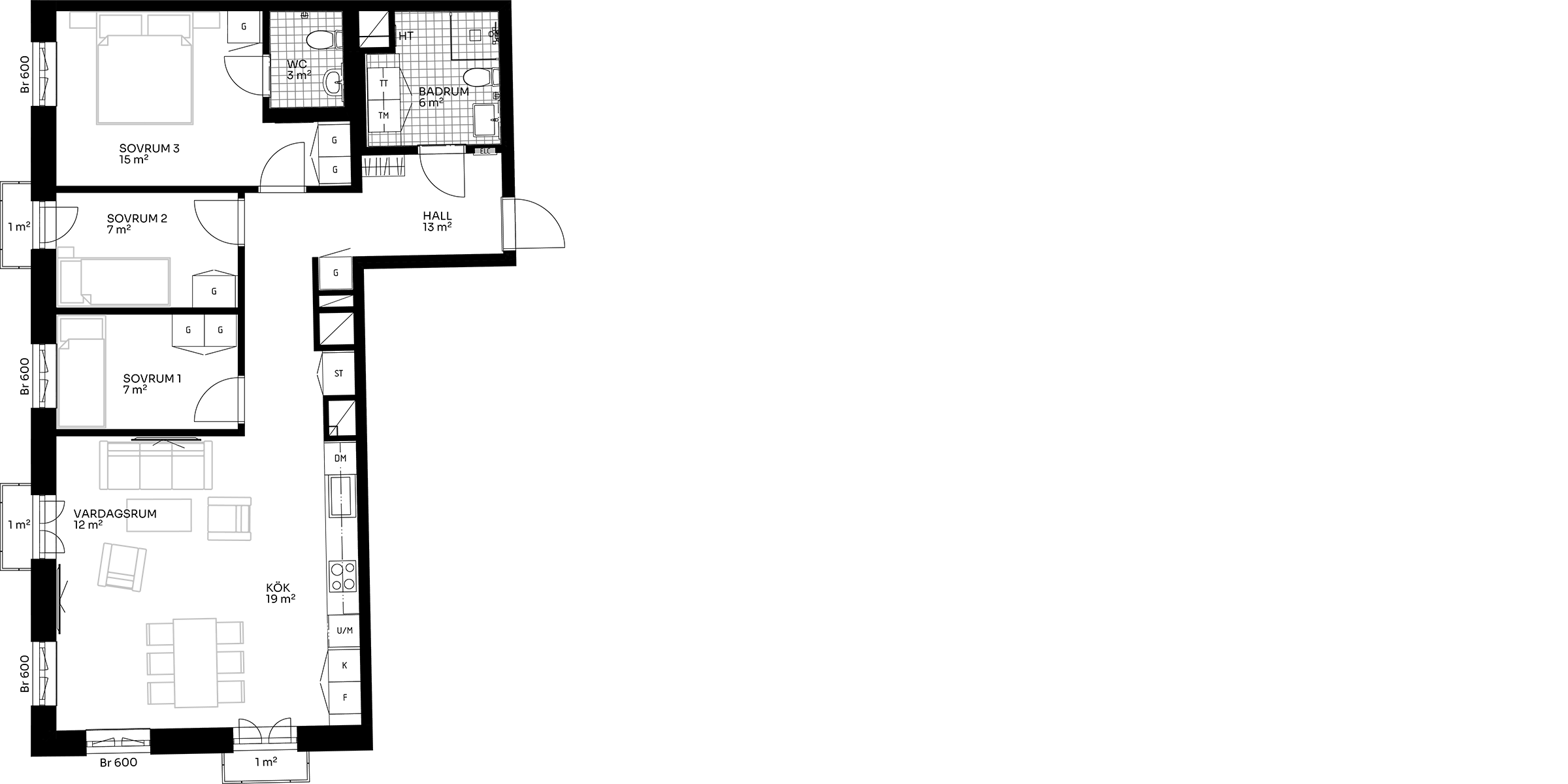 Bostadens nav är den öppna köks- och vardagsrumsdelen som badar i ljus tack vare stora fönsterpartier i två väderstreck. Här finns gott om plats för både matgrupp och soffhörna, vilket gör rummet till en perfekt yta för både vardagsliv och umgänge. Köket är fullt utrustat med integrerade vitvaror och en stilfull bänkskiva i granitkeramik som kombinerar funktionalitet med elegans.
